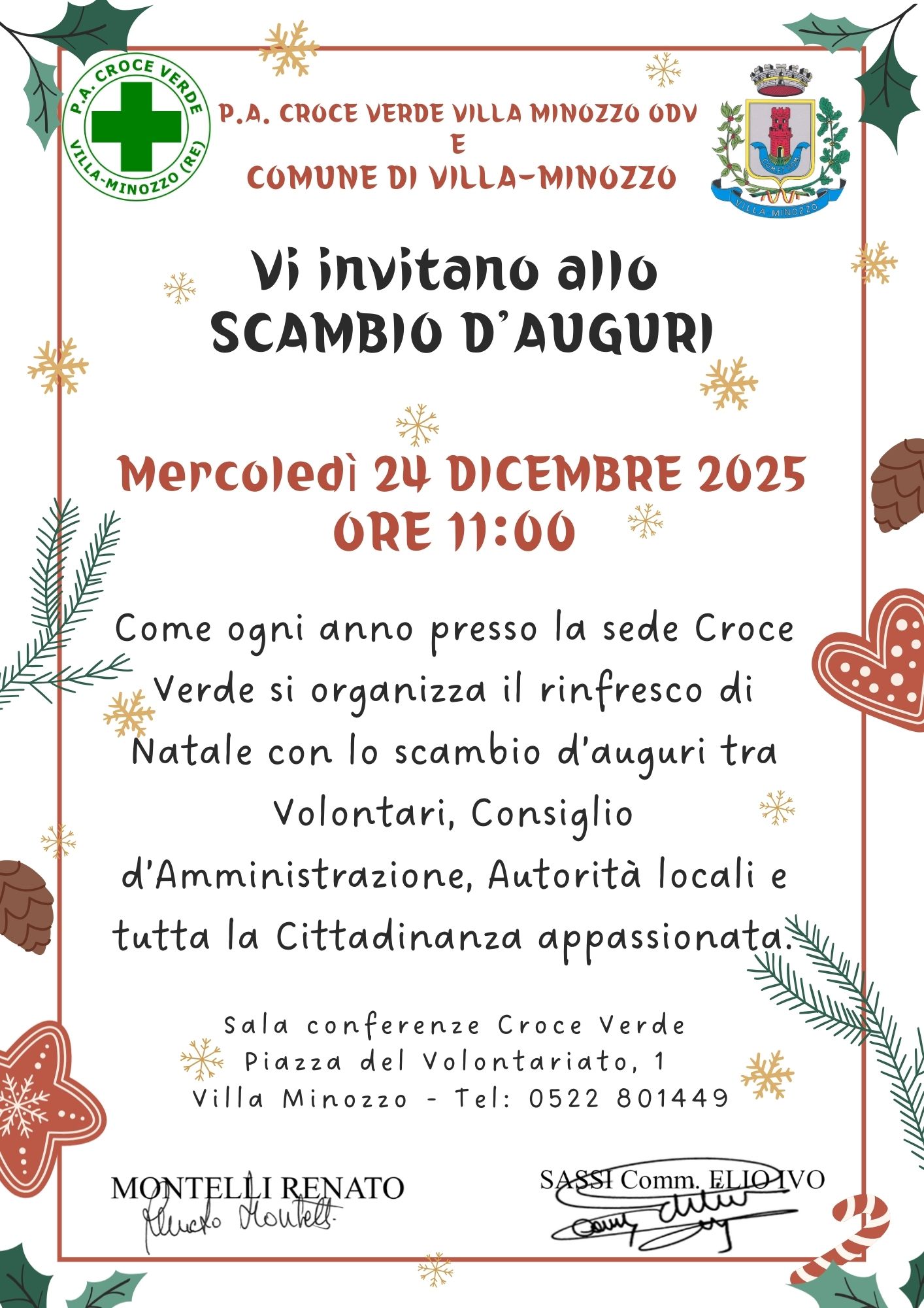 Mercoledì 24 dicembre 2025, alle ore 11:00, la P.A. Croce Verde Villa Minozzo ODV ed il Comune di Villa-Minozzo invitano la cittadinanza al tradizionale scambio d'Auguri di Natale